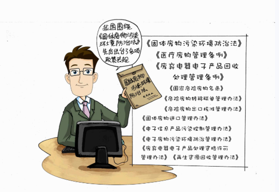 我国围绕《固体废物污染环境防治法》,先后出台了《医疗废物管理条例》《危险废物经营许可证管理办法》《废弃电器电子产品回收处理管理条例》等3项法规和《国家危险废物名录》《危险废物转移联单管理办法》《危险废物出口核准管理办法》《固体废物进口管理办法》《电子信息产品污染控制管理办法》《电子废物污染环境防治管理办法》《废弃电器电子产品处理资格许可管理办法》《再生资源回收管理办法》等多项部门规章。