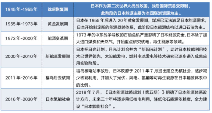 氢能在日本能源战略规划中占有极其重要地位,自第二次世界大战以来,日本能源体系发展自大致经历了六个阶段,日本近十年陆续制定《日本再复兴战略》《氢能与燃料电池战略发展路线图》《日本能源战略规划》等一系列政策,发展氢能已提升为日本国策,日本将建设全球第一个全面利用氢能的国家。