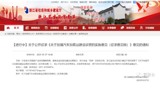 2023年3月7日,浙江省住建厅发布了《关于加强汽车加氢站建设运营的实施意见(征求意见稿)》。