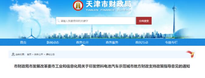近期,天津市财政局发布了、发改委和工信局三部门联合印发了《燃料电池汽车示范城市地方财政支持政策指导意见》。