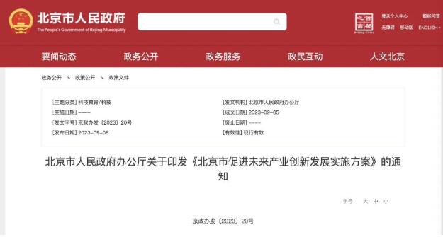 9月8日,北京市人民政府办公厅关于印发《北京市促进未来产业创新发展实施方案》的通知,下称《方案》。