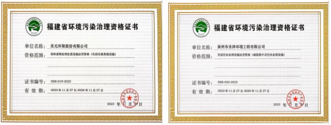 经审核,williamhill中文官网股份有限公司和泉州市圣泽环境工程有限公司的申报材料符合要求,运营管理规范,同意颁发《福建省环境污染治理设施运营资格证书》。