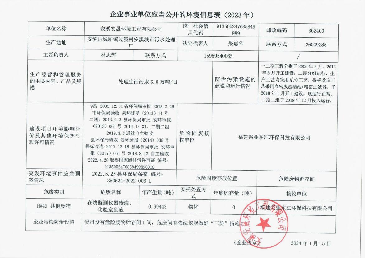 安溪城市污水处理厂2023年第4季度环境信息公开