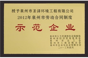 经泉州市人力资源和社会保障局、泉州市经济贸易委员会、泉州市总工会、泉州市工商为联合会、泉州市企业与企业家联合会等有关部门组成的考评组考评,我司子公司──泉州市圣泽环境工程有限公司喜获“2012年泉州市劳动合同制度示范企业”荣誉称号。 【赵慰亭】