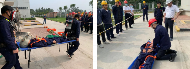 此次消防演练主要模拟员工在厌氧池下吸入有害气体中毒晕倒,随后展开救援、紧急撤离等一系列应急操作。