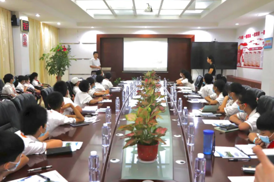 在会议室,小记者们观看宣传片,杨煌坤副总以通俗易懂的语言介绍垃圾处理设施及垃圾焚烧发电工艺。