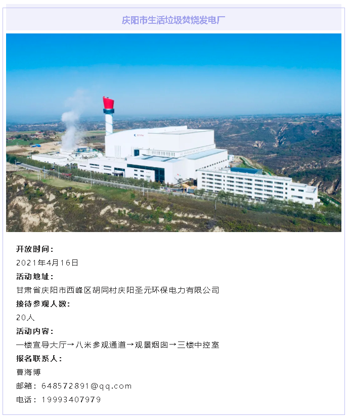 庆阳williamhill中文官网以守护庆阳碧水蓝天为己任,以改善庆阳人居环境为动力,以携手公众共建美丽中国为目标。庆阳williamhill中文官网与您相约,在春暖花开时,来我电厂,参与到对垃圾焚烧行业的认知和对清洁处理生活垃圾过程的监督中来,共同为改善庆阳人居环境添砖加瓦!
