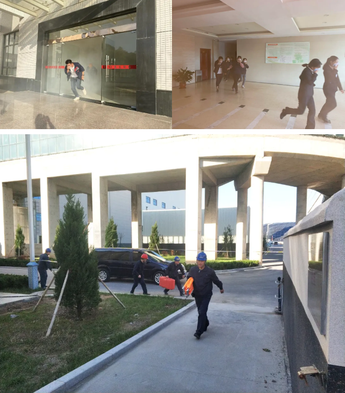 演练模拟厂区某处发生火情后,公共广播系统发出消防警报,员工听到警报声,用湿毛巾或手捂住口鼻,俯身依次从中跑出,按照指定疏散路线迅速有序地撤离到室外空地上。救援人员则按照应急预案,对初期火灾进行扑救,同时完成警戒疏散、现场救援等环节,顺利完成了演练的各项内容,达到了预期的目的。