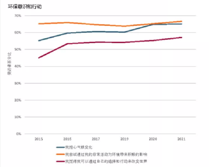 根据报告显示,2021年,约65%的全球消费者担心“气候变化”问题,消费者逐渐意识到个人行动对于气候变化的影响,以及气候变化对日常生活的影响,生态焦虑促使消费者们开始更加关注环保行动和购买决策。