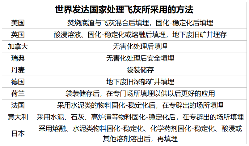 中国环保网盘点总结了当前世界上几大发达国家对飞灰的处理处置方法: