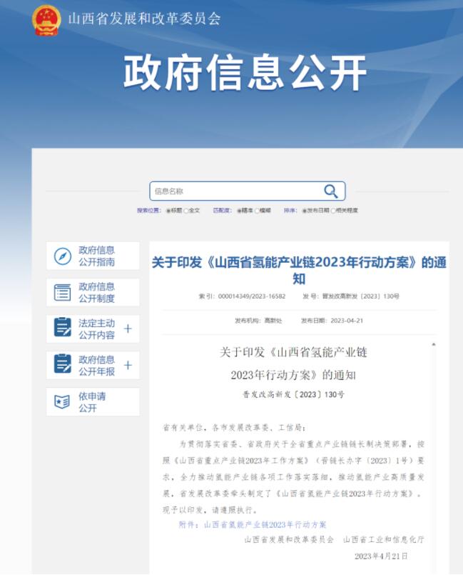 4月21日,山西省发改委发布关于印发《山西省氢能产业链2023年行动方案》的通知。