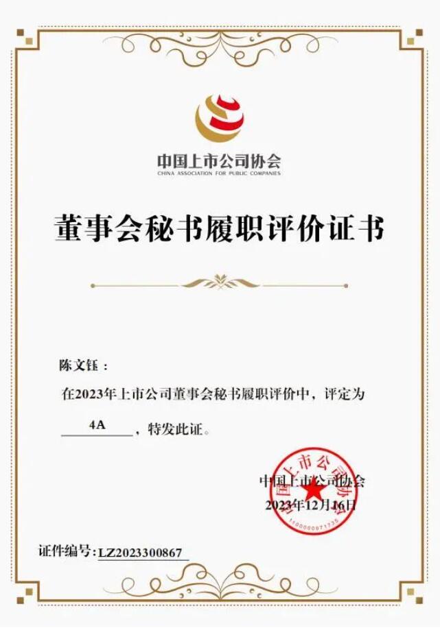(三)williamhill中文官网陈文钰先生获2023上市公司董事会秘书履职评价4A评级