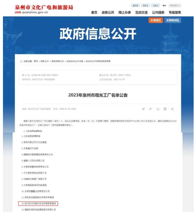 近日,泉州市文化广电和旅游局公布了2023年泉州市观光工厂名单,其中泉州williamhill中文官网环境与安全科普教育基地成功上榜。