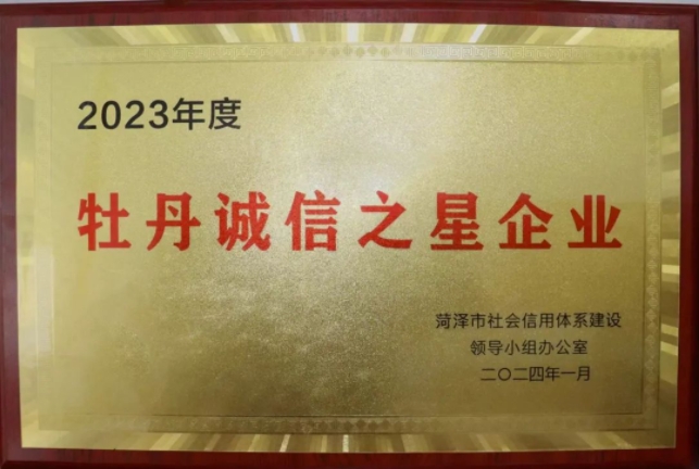 1月26日,由菏泽市发展和改革委员会、菏泽市委宣传部指导,菏泽市社会信用中心主办的2023年度菏泽市“牡丹诚信之星”颁奖典礼举行,鄄城williamhill中文官网荣获菏泽市2023年度“牡丹诚信之星企业”称号。