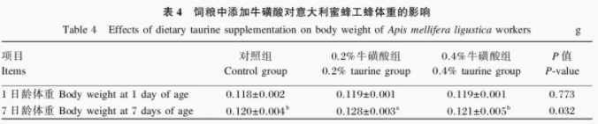 1.饲粮中添加牛磺酸对高温胁迫下7日龄意大利蜜蜂工蜂生长发育的影响