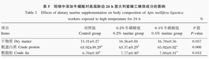 4.饲粮中添加牛磺酸对高温胁迫24h意大利蜜蜂工蜂体成分的影响