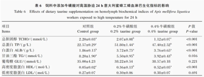 2.饲粮中添加牛磺酸对高温胁迫下7日龄意大利蜜蜂工蜂血淋巴生化指标的影响