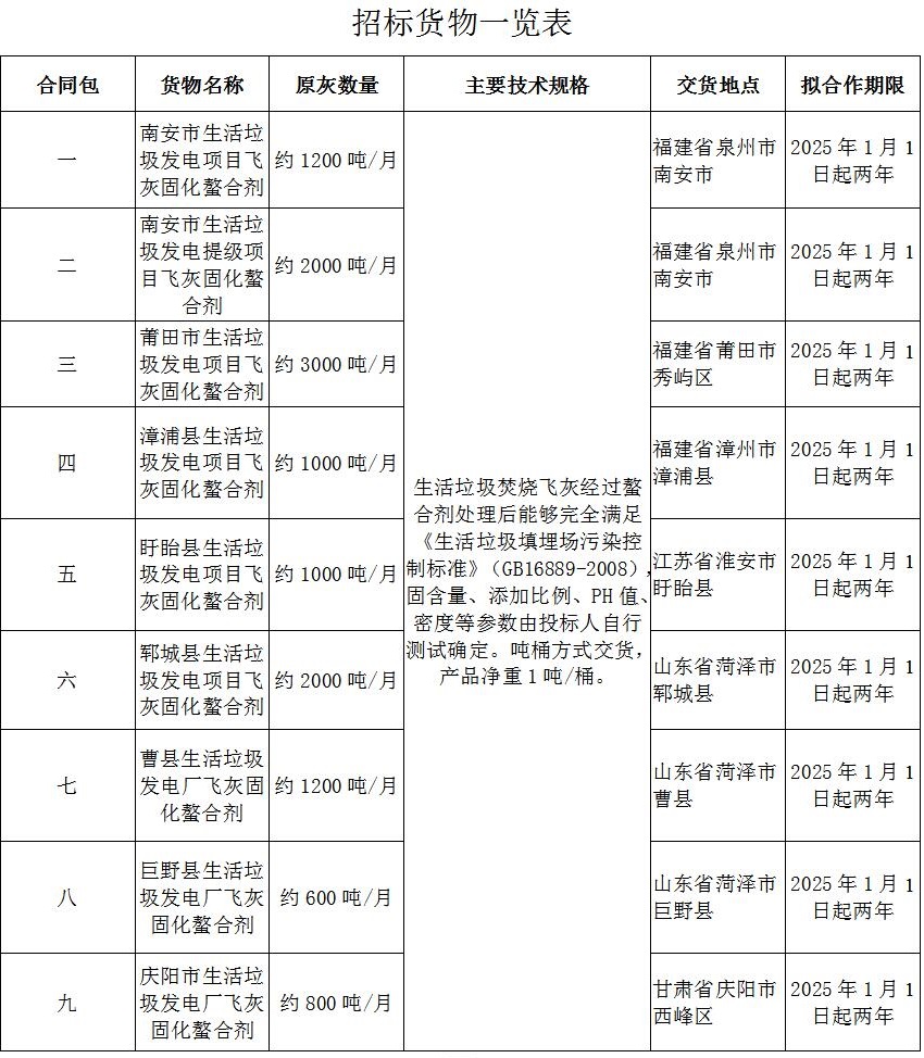 williamhill中文官网股份有限公司对南安市生活垃圾焚烧发电厂、南安市生活垃圾焚烧发电厂提级项目、莆田市生活垃圾焚烧发电厂、漳浦县生活垃圾焚烧发电厂、盱眙县生活垃圾焚烧发电厂、郓城县生活垃圾焚烧发电厂、曹县生活垃圾焚烧发电厂、巨野县生活垃圾焚烧发电厂、庆阳市生活垃圾焚烧发电厂飞灰固化螯合剂采购项目的下述货物及服务进行国内公开招标,现欢迎国内合格的投标人前来提交密封的投标。