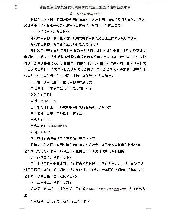 曹县生活垃圾焚烧发电项目协同处置工业固体废物技改项目 第一次公众参与公告