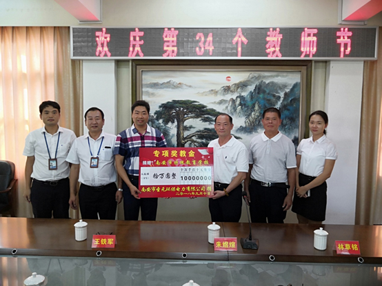 尤志添校长介绍了学校的发展历史、师资团队及新学年规划情况。朱煜煊董事长向工作在特教工作岗位的教育工作者致以节日的问候,对特教学校的各项工作给予了高度的评价。朱煜煊董事长表示,当老师很辛苦,当特教老师更辛苦,感谢特教老师们为全市残疾人教育事业做出的突出贡献,同时感谢南安市特殊教育学校作为邻居对南安市williamhill中文官网电力有限公司各项工作的大力支持和关注,williamhill中文官网会一如既往地的支持特教事业。会上,尤志添校长接受了朱煜煊董事长捐款设立的特校教职工的“奖教金”,朱煜煊董事长还向全体教师发放了慰问品。